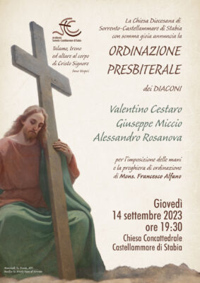 Giovedì 14 settembre alle ore 19:30 presso la Concattedrale di Castellammare di Stabia, saranno ordinati presbiteri i tre diaconi, Valentino Cestaro, Giuseppe Miccio, Alessandro Rosanova.