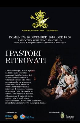 Quest’anno il presepe della Parrocchia di Sant’Agnello sarà allestito con i pastori del’700 che furono trafugati 18 anni fa. Il 16 dicembre, dopo una Solenne Messa di Ringraziamento, tutti potranno finalmente rivedere le statuine alle quali noi santanellesi eravamo e siamo emotivamente legati e devoti. I pastori ritrovati sono per noi un ponte con il passato, un ricordo di legami e tradizioni che il tempo e le vicende non hanno interrotto. Venite a visitare il nostro “presepe ritrovato”!