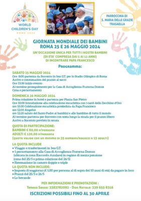 19 Aprile 2024Parrocchia di Trasaella alla Giornata Mondiale dei Bambini sabato 25 Maggio Descrizione: il programma Inizio: 25/05/2024 10:00 Fine: 26/05/2024 20:00 Categorie: Appuntamenti parrocchiali Città: Sorrento Regione: Campania Paese: Italia
