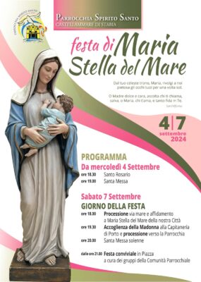 5 Agosto 2024Parrocchia Spirito Santo: la Festa di Maria Stella del Mare mercoledì 4 Settembre Descrizione: Castellammare di Stabia, Parrocchia Spirito Santo La Festa di Maria Stella del Mare si terrà da mercoledì 4 a sabato 7 settembre 2024. Inizio: 04/09/2024 09:00 Fine: 07/09/2024 20:00 Categorie: Appuntamenti parrocchiali Città: Sorrento Regione: Campania Paese: Italia