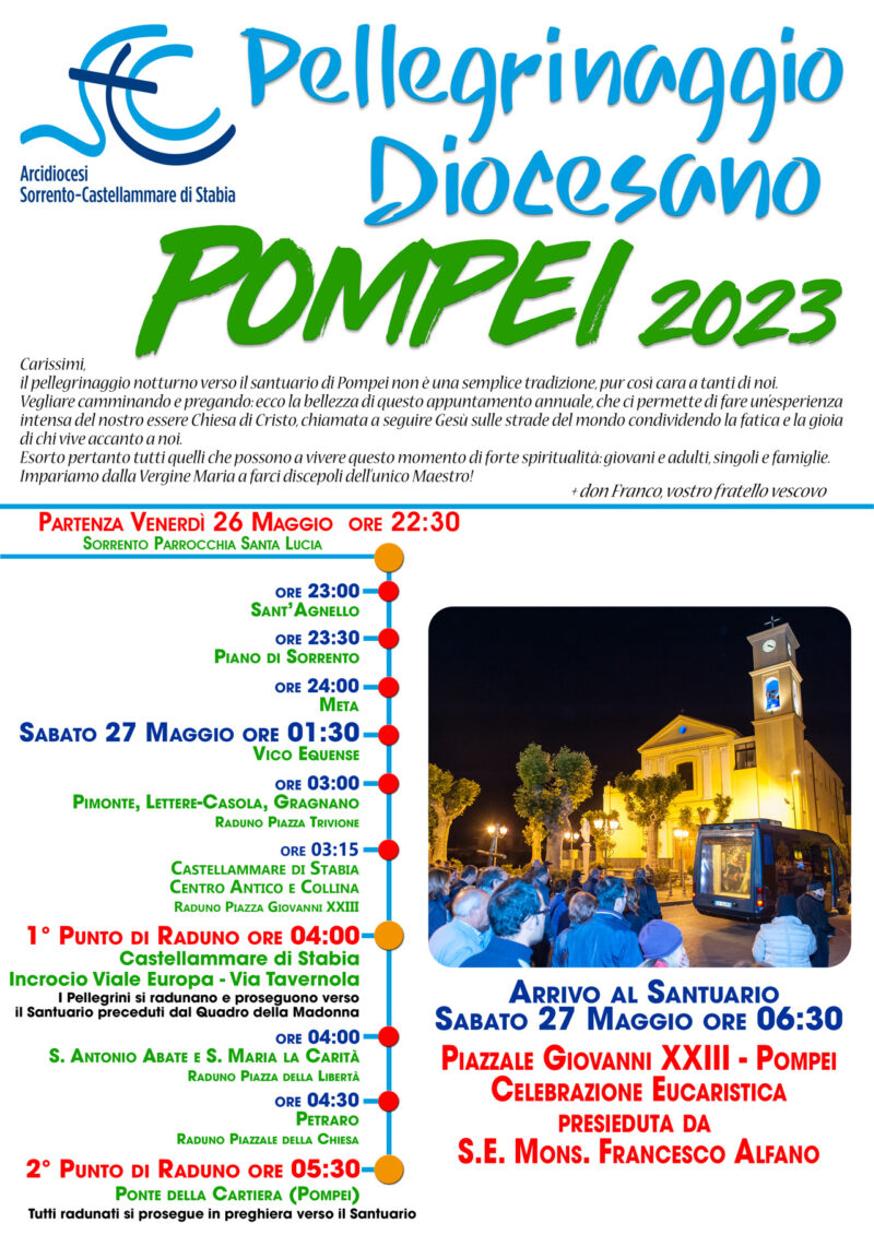 Mons. Francesco Alfano si aggregherà al pellegrinaggio da Castellammare di Stabia insieme al Quadro pellegrino. All’arrivo nel Piazzale Giovanni XXIII del Santuario di Pompei, l’Arcivescovo Alfano, presiederà la Celebrazione dell’Eucarestia alle ore 6:30.