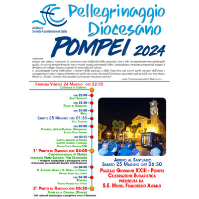 Sabato 25 maggio ore 06:30 piazzale Giovanni xxiii – Pompei celebrazione eucaristica presieduta da Mons. Francesco Alfano.