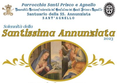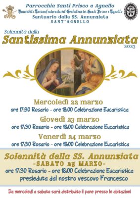 21 Marzo 2023Sant’Agnello. Solennità della Santissima Annunziata mercoledì 22 Marzo Descrizione: Inizio: 22/03/2023 17:00 Fine: 24/03/2023 19:00 Categorie: Appuntamenti parrocchiali Città: Sorrento Regione: Campania Paese: Italia