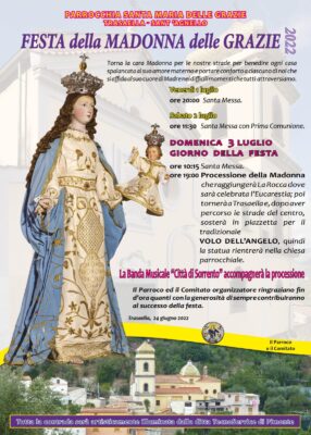 27 Giugno 202227 Giugno 2022Sant’Agnello. Trasaella in festa per la Madonna delle Grazie venerdì 1 Luglio Descrizione: Nel borgo di Trasaella (SAnt’Agnello), si festeggia la Madonna delle Grazie. Inizio: 01/07/2022 20:00 Fine: 03/07/2022 23:00 Categorie: Appuntamenti parrocchiali Città: Sorrento Regione: Campania Paese: Italia