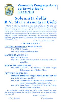 31 Luglio 2019Solennità della Beata Vergine Maria Assunta in Cielo giovedì 15 Agosto Descrizione: programma Data: 15/08/2019 (tutto il giorno) Categorie: Appuntamenti parrocchiali Indirizzo: Sorrento, NA, Italia Città: Sorrento Regione: Campania Paese: Italia Solennità della Beata Vergine Maria Assunta in CieloSorrento, NA, Italia