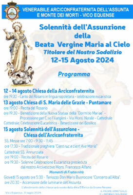 9 Agosto 2024Solennità dell’Assunta Vico Equense lunedì 12 Agosto Descrizione: Programma Inizio: 12/08/2024 00:00 Fine: 15/08/2024 23:00 Categorie: Appuntamenti parrocchiali Città: Sorrento Regione: Campania Paese: Italia