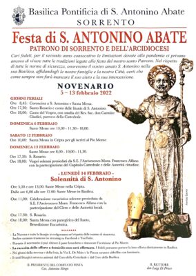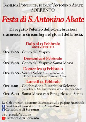 7 Febbraio 20229 Febbraio 2022Solennità di Sant’Antonino Abate lunedì 14 Febbraio Descrizione: Programma Inizio: 14/02/2022 00:00 Fine: 14/02/2022 23:00 Categorie: Appuntamenti diocesani Città: Sorrento Regione: Campania Paese: Italia