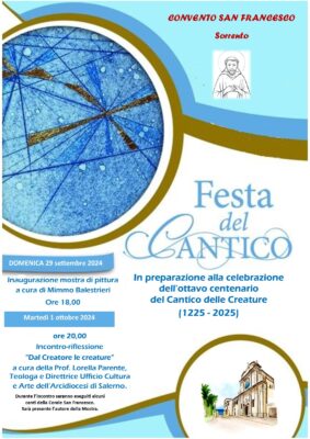 23 Settembre 2024Sorrento, al Convento di San Francesco la Festa del Cantico domenica 29 Settembre Descrizione: La Festa del Cantico in preprazione alla celebrazione dell’ottavo centenario del Cantico delle Creature (1225 – 2025) Inizio: 29/09/2024 18:00 Fine: 29/09/2024 22:00 Categorie: Appuntamenti parrocchiali Città: Sorrento Regione: Campania Paese: Italia