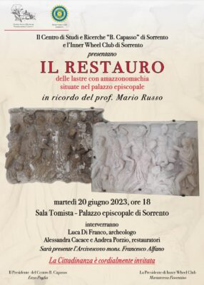 Martedì 20 giugno 2023, alle ore 18, nella storica Sala Tomista del palazzo episcopale di Sorrento, il Centro di Studi e Ricerche “B. Capasso” di Sorrento e l’Inner Wheel Club di Sorrento presenteranno il restauro dei marmi con scene di amazzonomachia conservati sullo scalone del medesimo palazzo episcopale.