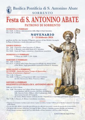 29 Gennaio 2024Sorrento: Festa di Sant’Antonino Abate lunedì 5 Febbraio Descrizione: Inizio: 05/02/2024 09:00 Fine: 15/02/2024 20:00 Categorie: Appuntamenti diocesani Città: Sorrento Regione: Campania Paese: Italia