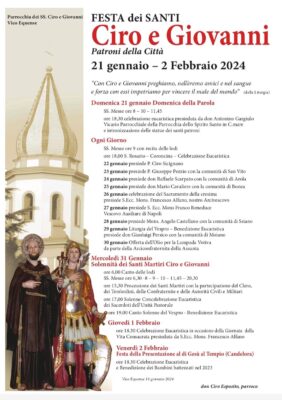 16 Gennaio 2024Vico Equense: la Festa dei Santi Ciro e Giovanni domenica 21 Gennaio Descrizione: Inizio: 21/01/2024 08:00 Fine: 02/02/2024 19:00 Categorie: Appuntamenti parrocchiali Città: Sorrento Regione: Campania Paese: Italia