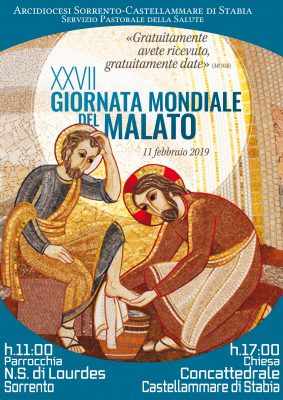 9 Gennaio 201923 Gennaio 2019XXVII Giornata Mondiale del Malato lunedì 11 Febbraio Descrizione: Ore 11:00 Parrocchia Nostra Signora di Lourdes, Marano Sorrento Ore 17:00 Concattedrale , Castellammare di Stabia Data: 11/02/2019 (tutto il giorno) Categorie: Appuntamenti diocesani Città: Sorrento Regione: Campania Paese: Italia