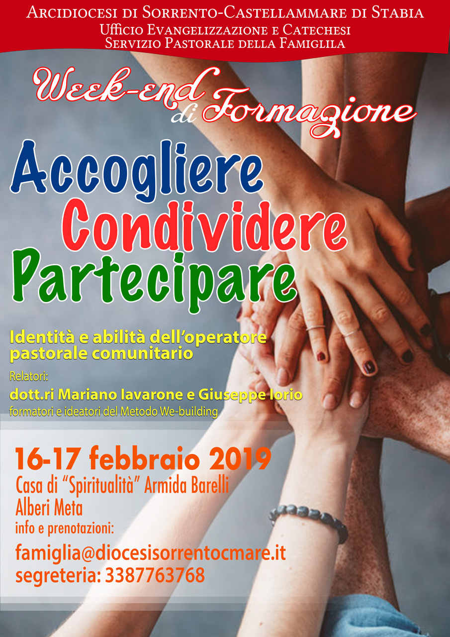 sabato 16 Febbraio 15:00 Weekend di Formazione: ACCOGLIERE, PARTECIPARE, CONDIVIDERE… Identità e abilità dell’operatore pastorale comunitario.Inizio: 16/02/2019 15:00
