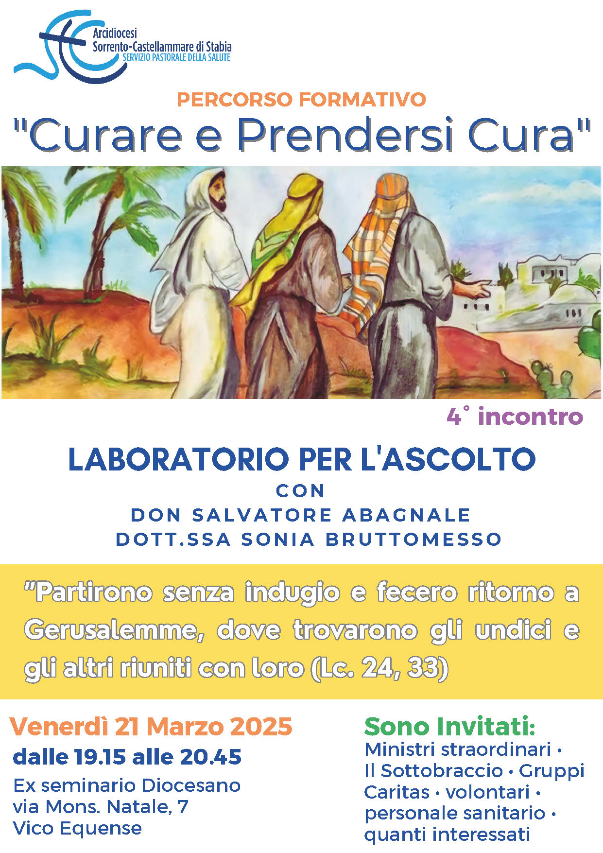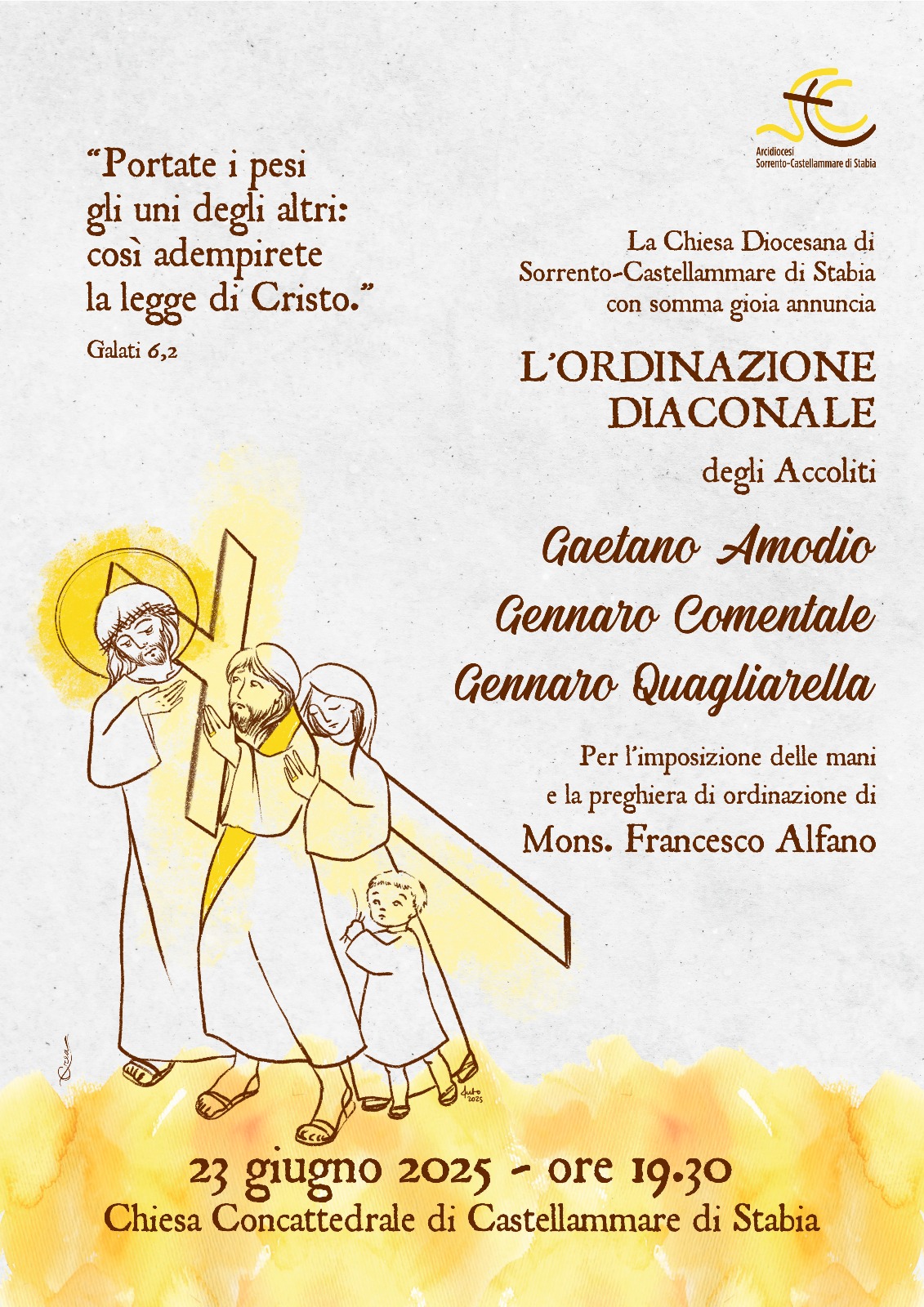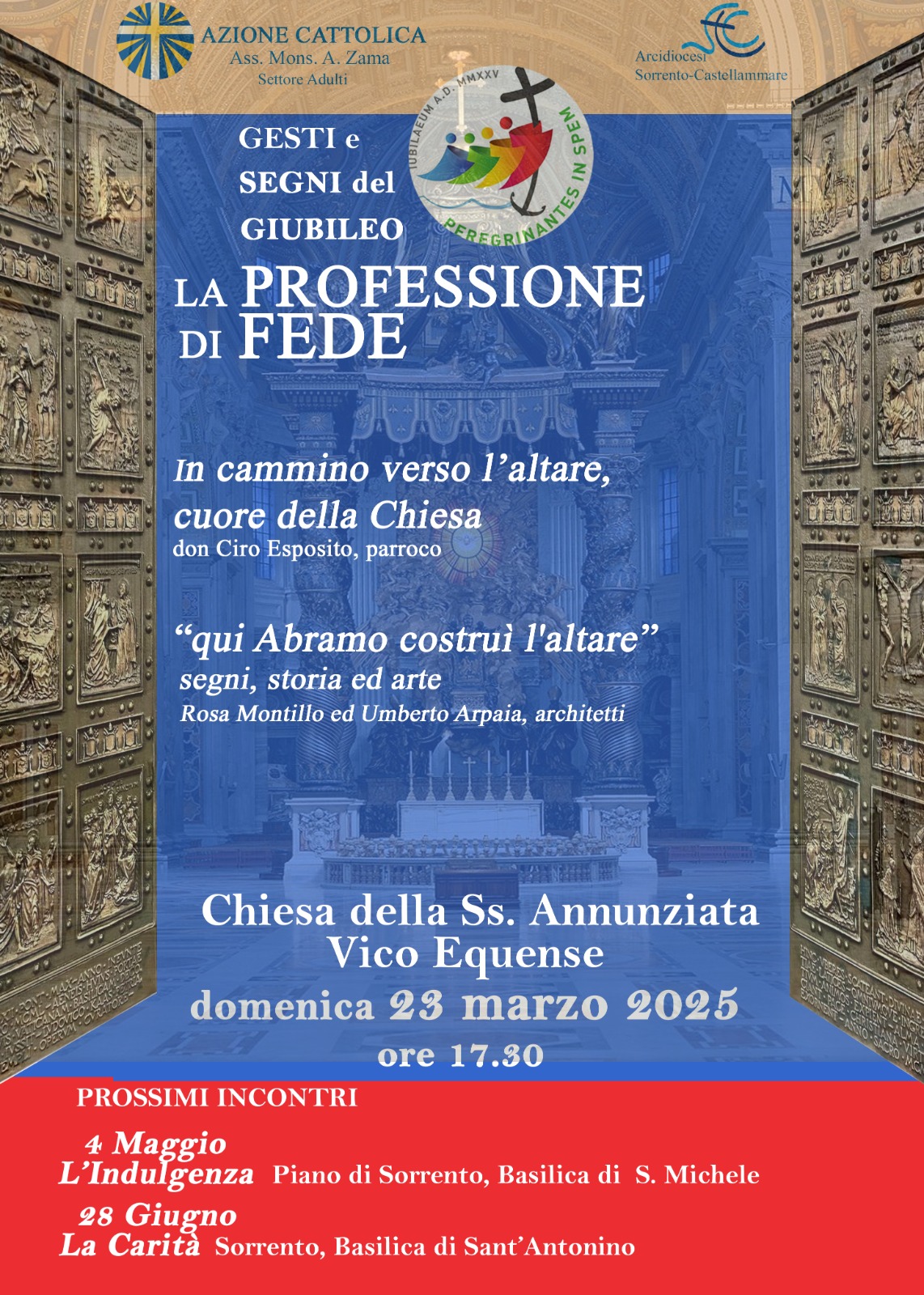 giovedì 4 Settembre 20:30 Musical “I Miserabili”, Preghiera Musicale al Giardino Romantico – Massa LubrenseInizio: 04/09/2025 20:30 giovedì 21 Agosto 20:00 Musical “I Miserabili”, Preghiera Musicale al Centro Pastorale di Sant’AgnelloInizio: 21/08/2025 20:00 martedì 19 Agosto 20:30 Musical “I Miserabili”, Preghiera Musicale al Chiostro della Trinità di Vico EquenseInizio: 19/08/2025 20:30 domenica 27 Luglio 00:00 Il Cammino dell’Angelo Monte Faito 2025Inizio: 27/07/2025 00:00 sabato 26 Luglio 09:30 Incontri con le Adoratrici a Castellammare di StabiaInizio: 26/07/2025 09:30 giovedì 24 Luglio 20:30 Musical “I miserabili”, Preghiera Musicale all’Oratorio Sacri Cuori – Messigno – PompeiInizio: 24/07/2025 20:30 giovedì 17 Luglio 20:00 Musical “I miserabili”, Preghiera Musicale alla Chiesa del Corpus DominiInizio: 17/07/2025 20:00 lunedì 30 Giugno AC: Campo Scuola AdultiData: 30/06/2025 Iscrizioni entro il 30 giugno mercoledì 25 Giugno 00:00 Papa Leone XIV benedirà l’icona restaurata della Madonna di PozzanoInizio: 25/06/2025 00:00 lunedì 23 Giugno 19:30 Ordinazione Diaconi PermanentiInizio: 23/06/2025 19:30 mercoledì 4 Giugno 19:00 Ordinazione DiaconaleInizio: 04/06/2025 19:00 venerdì 30 Maggio 22:30 Pellegrinaggio diocesano a Pompei 2025Inizio: 30/05/2025 22:30 lunedì 26 Maggio 20:00 “Testimoni di Speranza”: storie di accoglienza e rinascitaInizio: 26/05/2025 20:00 lunedì 26 Maggio 19:30 AC: Laboratorio di Formazione “Riflessioni sul tema della CittadinanzaInizio: 26/05/2025 19:30 giovedì 1 Maggio 09:00 Sant’Antonino Pellegrino di Speranza da Sorrento a StabiaInizio: 01/05/2025 09:00 domenica 6 Aprile 20:30 Attraverso il DesertoInizio: 06/04/2025 20:30 giovedì 3 Aprile 19:30 L’UP di Pimonte incontra Matilde Lauria, campionessa paralimpica napoletanaInizio: 03/04/2025 19:30 domenica 23 Marzo 17:30 “Se dimorate nella mia Parola, siete veramente miei discepoli”Inizio: 23/03/2025 17:30 venerdì 21 Marzo 19:15 4° Incontro “Curare e Prendersi Cura”Inizio: 21/03/2025 19:15 giovedì 20 Marzo 20:00 Camminando s’apre il cammino: ecco i prossimi appuntamentiInizio: 20/03/2025 20:00
