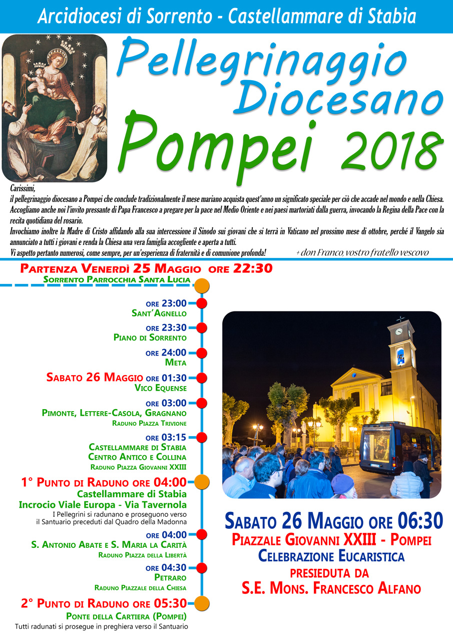 venerdì 25 Maggio 22:30 Pellegrinaggio Diocesano Pompei 2018: in cammino per la paceInizio: 25/05/2018 22:30 sabato 19 Maggio 20:30 Veglia di Pentecoste UP Massa LubrenseInizio: 19/05/2018 20:30Organizzatore: venerdì 18 Maggio 19:30 Incontro con Enzo BianchiInizio: 18/05/2018 19:30 domenica 13 Maggio 18:30 Precessione di San CatelloInizio: 13/05/2018 18:30