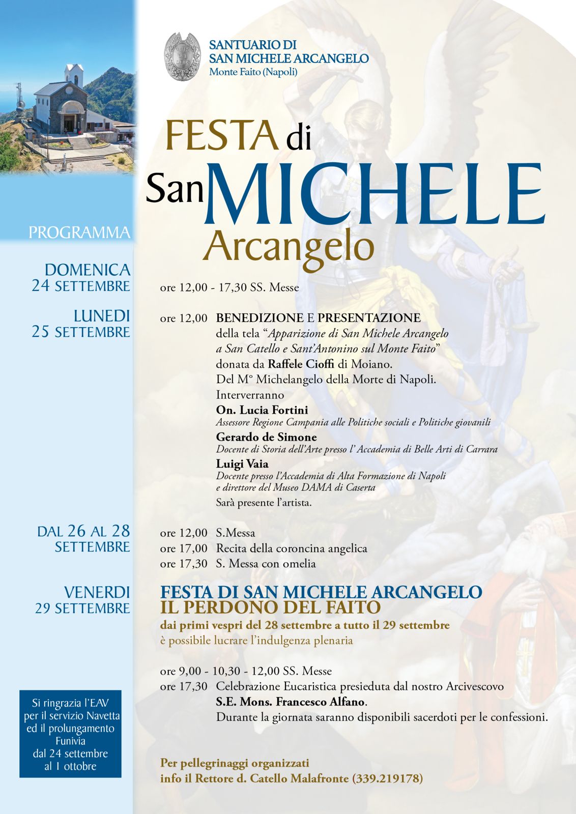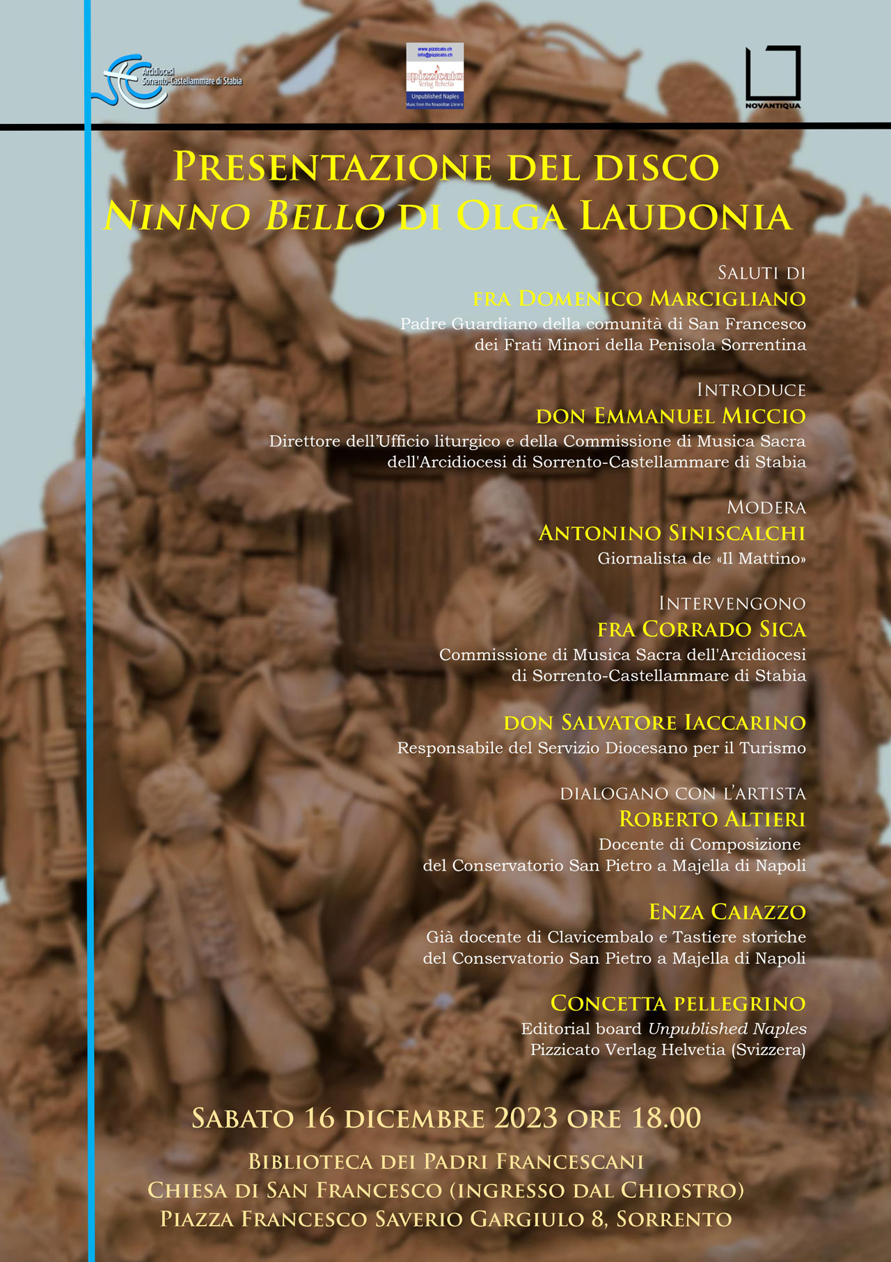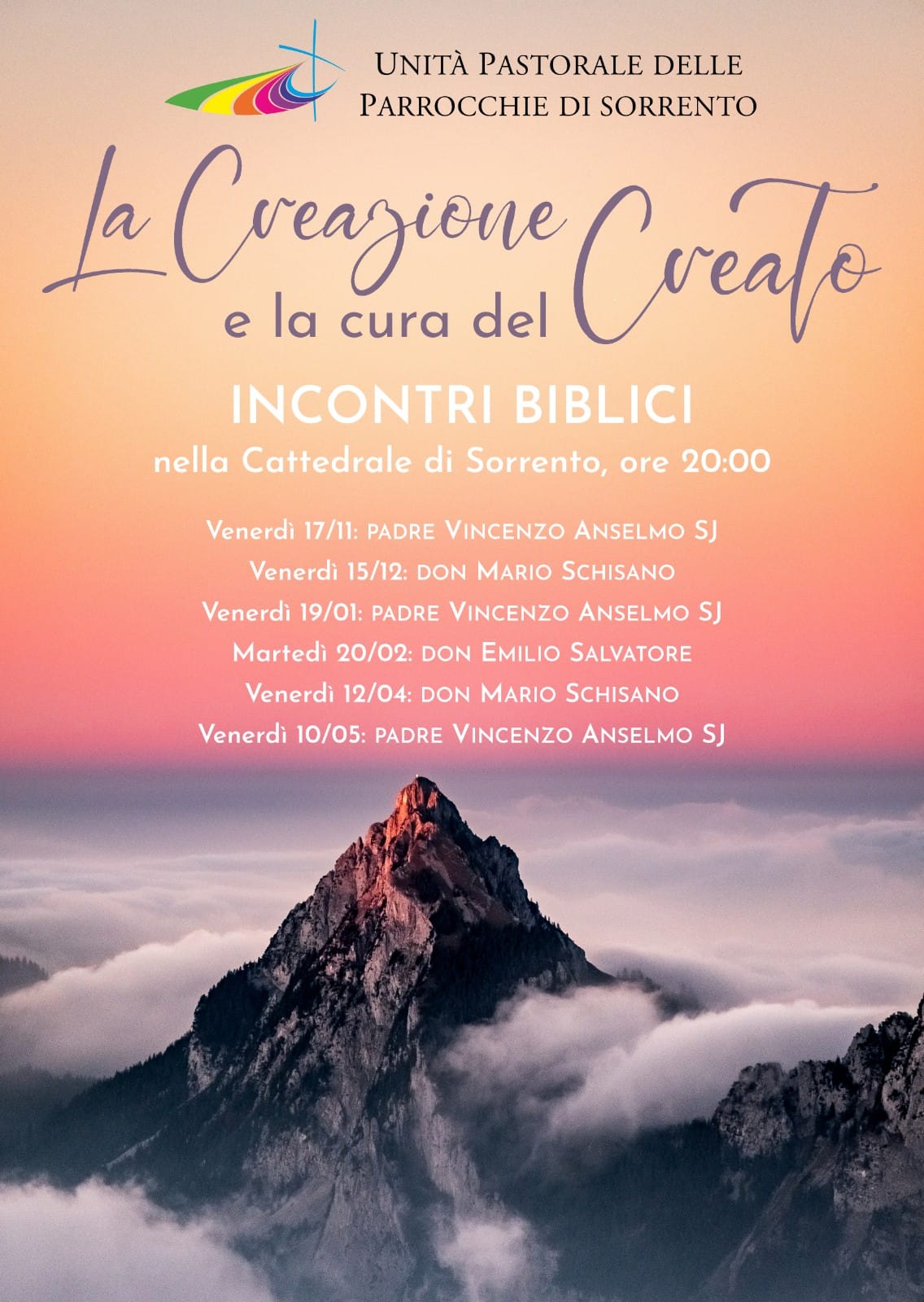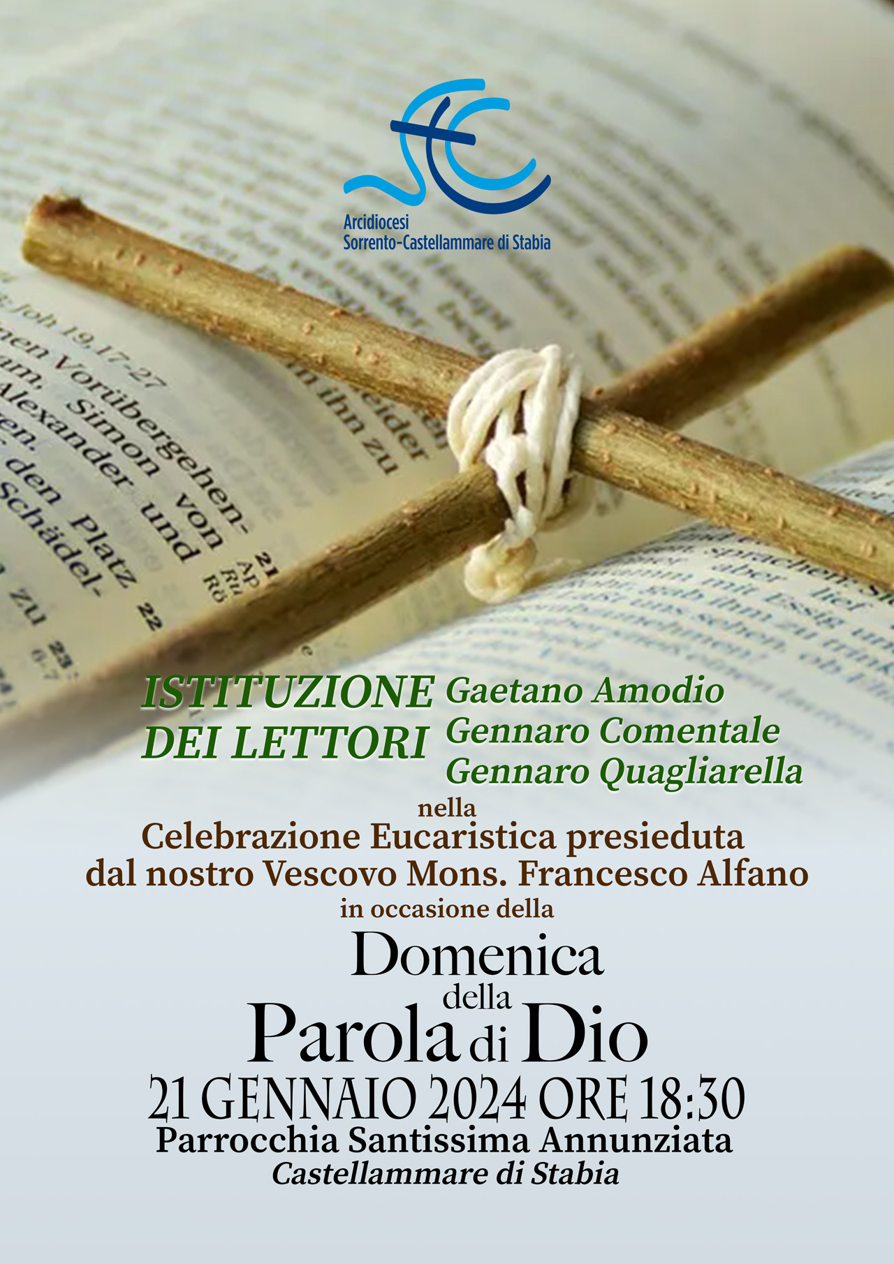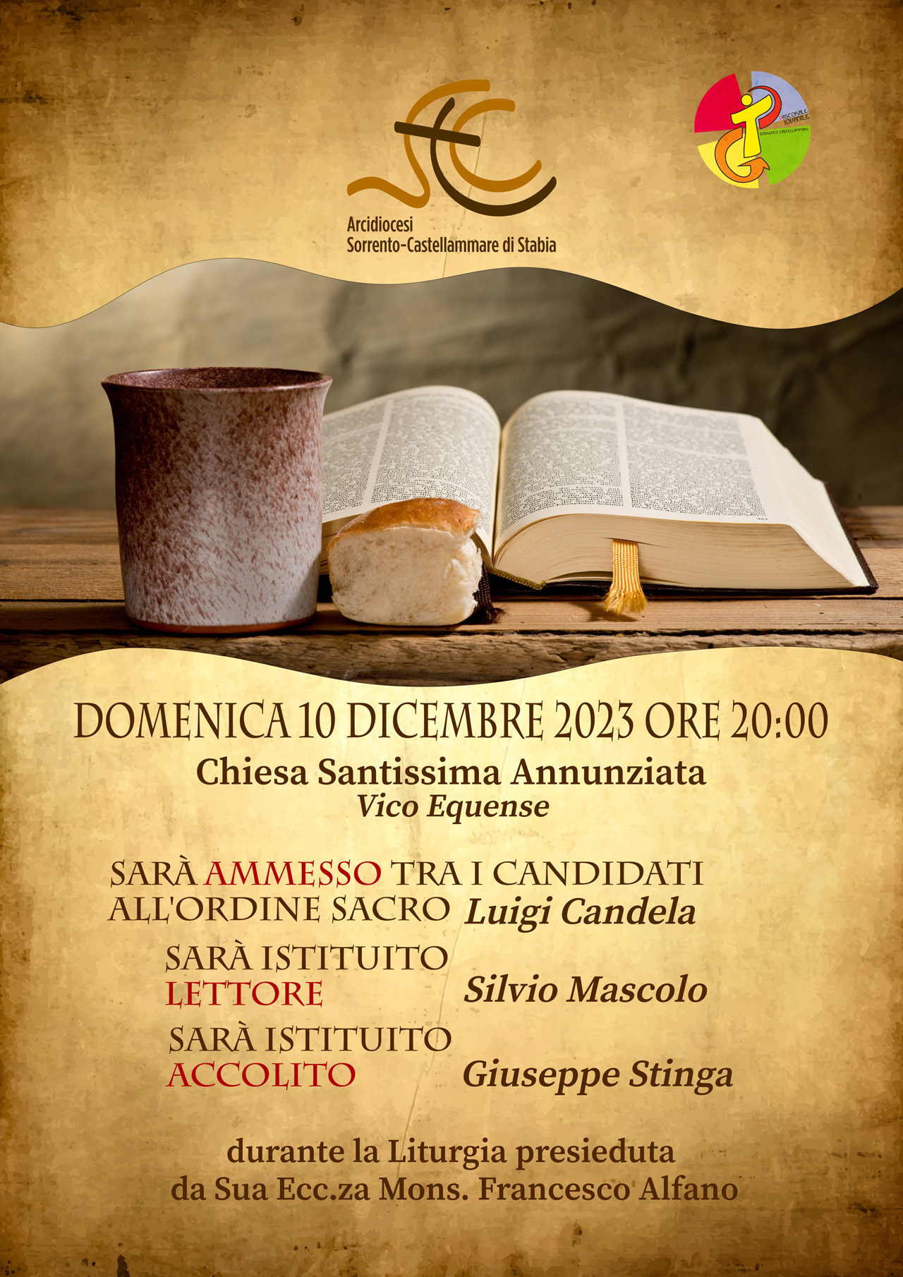 sabato 24 Febbraio 18:00 Laboratori di Musica SacraInizio: 24/02/2024 18:00 sabato 24 Febbraio 16:00 Catechesi Liturgica sulla Settimana Santa “Dalla Teologia alla Prassi”Inizio: 24/02/2024 16:00 sabato 17 Febbraio 19:00 Preghiera-Concerto EcumenicaInizio: 17/02/2024 19:00 sabato 17 Febbraio 18:00 Laboratori di Musica SacraInizio: 17/02/2024 18:00 giovedì 8 Febbraio 19:00 Curare e prendersi cura: il secondo incontroInizio: 08/02/2024 19:00 mercoledì 7 Febbraio 19:30 Incontro di Formazione Liturgica per Fotografi e VideoperatoriInizio: 07/02/2024 19:30 lunedì 5 Febbraio 09:00 Sorrento: Festa di Sant’Antonino AbateInizio: 05/02/2024 09:00 domenica 4 Febbraio 17:30 La forza della vita ci sorprendeInizio: 04/02/2024 17:30 domenica 21 Gennaio 18:30 Istituzione dei LettoriInizio: 21/01/2024 18:30 martedì 16 Gennaio 19:30 “𝙉𝙪 𝘿𝘿𝙞𝙤 𝙘𝙖𝙧𝙣𝙖𝙡𝙚 – 𝙨𝙚𝙣𝙩𝙞𝙢𝙚𝙣𝙩𝙞 𝙚 𝙧𝙚𝙡𝙖𝙯𝙞𝙤𝙣𝙞 𝙙𝙞 𝙂𝙚𝙨𝙪̀ 𝙣𝙚𝙡 𝙥𝙧𝙞𝙢𝙤 𝙑𝙖𝙣𝙜𝙚𝙡𝙤”Inizio: 16/01/2024 19:30 mercoledì 10 Gennaio 09:00 Solennità di San Catello 2024: il programma degli eventi religiosiInizio: 10/01/2024 09:00 sabato 16 Dicembre 18:00 Presentazione Disco Olga LaudoniaInizio: 16/12/2023 18:00 domenica 10 Dicembre 20:00 Tappe importanti per giovani in camminoInizio: 10/12/2023 20:00 sabato 25 Novembre 17:00 Primi Vespri nella Solennità di Cristo Re dell’UniversoInizio: 25/11/2023 17:00 venerdì 17 Novembre 20:00 La Creazione a la cura del CreatoInizio: 17/11/2023 20:00 domenica 22 Ottobre 00:00 Giornata Missionaria MondialeInizio: 22/10/2023 00:00 sabato 21 Ottobre 09:00 AVO: XV Giornata NazionaleInizio: 21/10/2023 09:00 sabato 30 Settembre 19:00 Cattedrale Sorrento Incontro con Rosy BindiInizio: 30/09/2023 19:00 venerdì 29 Settembre 00:00 Festa San Michele a FaitoInizio: 29/09/2023 00:00 giovedì 14 Settembre 19:30 Ordinazioni Presbiterali: tre nuovi sacerdoti per la nostra Chiesa diocesanaInizio: 14/09/2023 19:30