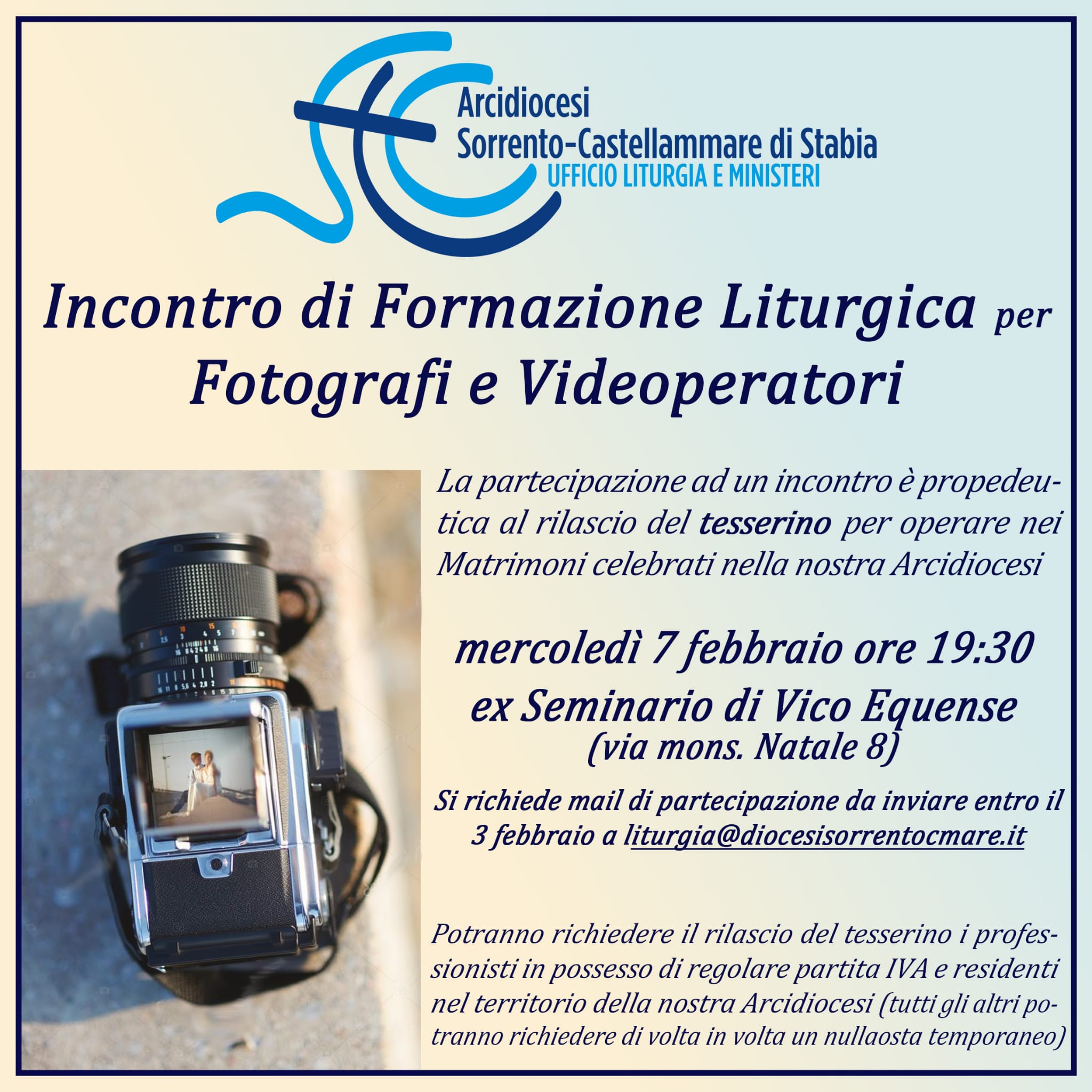 mercoledì 7 Febbraio 19:30 Incontro di Formazione Liturgica per Fotografi e VideoperatoriInizio: 07/02/2024 19:30