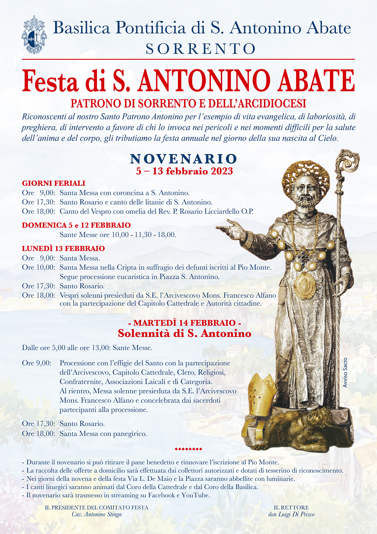 domenica 5 Febbraio 00:00 Solennità di Sant’Antonino: il programma degli eventi religiosiInizio: 05/02/2023 00:00