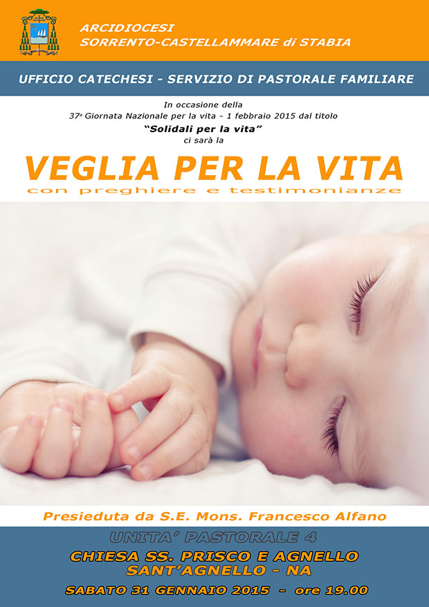 Anche quest’anno il servizio di Pastorale Familiare ha organizzato un momento di preghiera e testimonianza sull’accoglienza della vita, in occasione della 37° giornata della Vita del 1 febbraio 2015 dal titolo”Solidali per la vita”, che si terrà sabato 31 gennaio alle ore 19.00 nella Parrocchia dei S.S. Prisco e Agnello (Sant’Agnello).